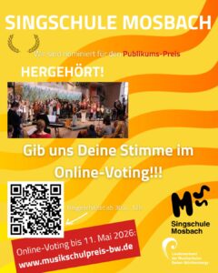 Die Singschule Mosbach wurde für den Musikschulpreis Baden-Württemberg 2026 nominiert. Eine Fachjury wählte die acht Initiativen aus, die sich mit besonderem Engagement für Teilhabe und Vielfalt in der musikalischen Bildung einsetzen. Nun brauchen wir Ihre Unterstützung: Stimmen Sie bis zum 11. Mai 2026, 12 Uhr online ab, geben Sie diese Info weiter, posten Sie das angefügte Plakat in Ihren Apps und Social-Media-Kanälen. Weitere Informationen zu allen nominierten Projekten sowie den Link zur Online-Abstimmung finden Sie unter www.musikschulpreis-bw.de/abstimmung.